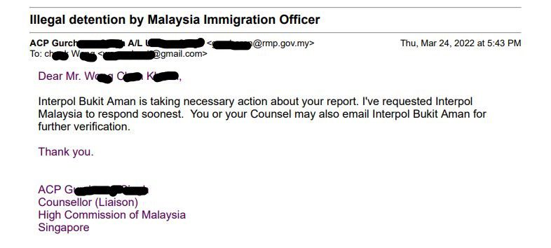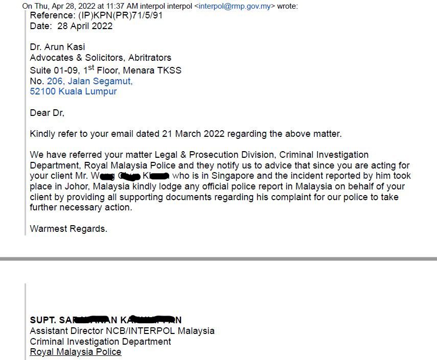 On 21.3.2022, my Malaysian lawyer wrote an email to the Royal Malaysia Police, requesting for a status update after more than three months of non-reply from PDRM. The Counsellor (Liaison) with the Malaysia High Commission in Singapore replied that PDRM is taking necessary actions about my reports (email attached).