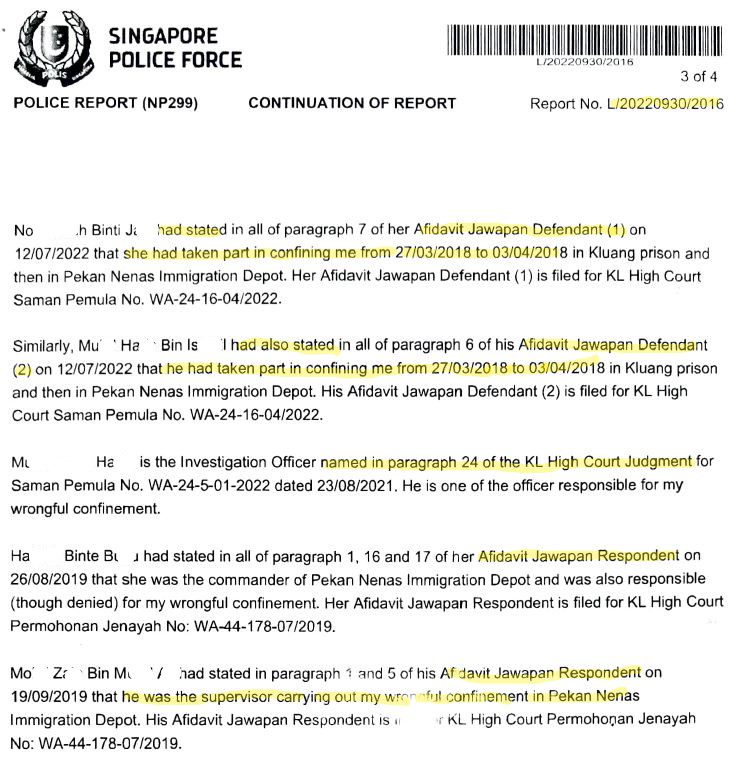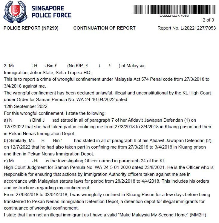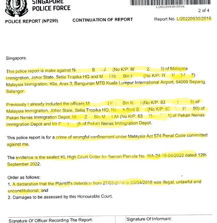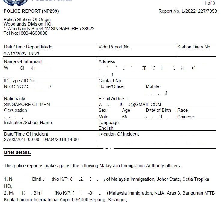 On 8.12.2021, I made four police reports against Immigration Department of Malaysia officers at a Singapore police station. These four police reports were transmitted to the Royal Malaysia Police (PDRM) at Bukit Aman police HQ via Interpol, for their action as advised by the ACP (Counsellor liaison), High Commission of Malaysia.