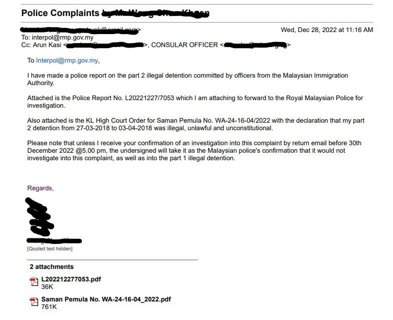 I made one final police report for part 2 illegal detention and attached the high court order again as evidence on the 27.12.2022 which were then sent to PDRM in an email for their confirmation on whether they will be investigating or not by return email by end of day on 30.12.2022. This is to give notice that after this 30.12.2022 date, court judicial review action would commence.